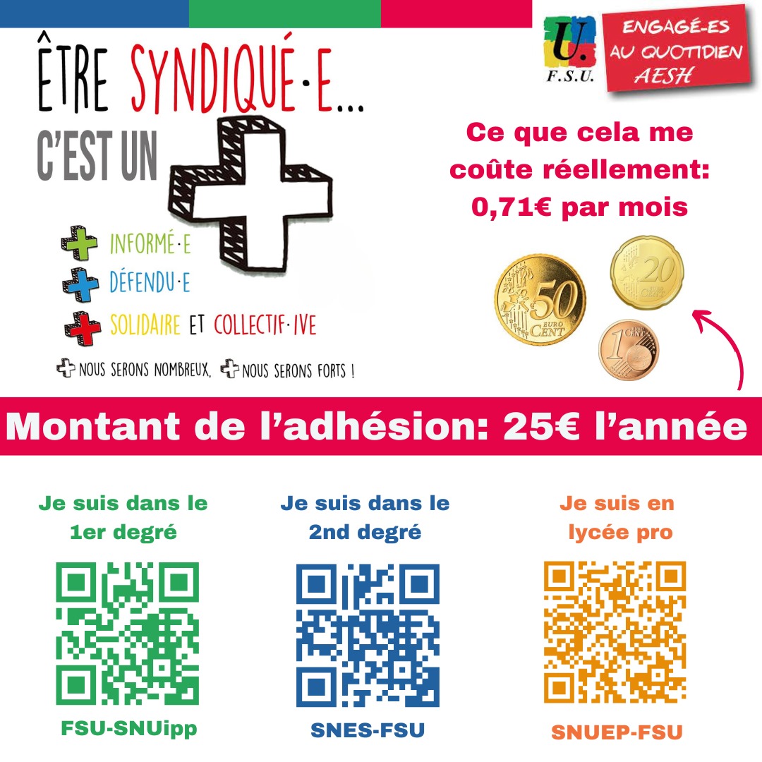 Ce jeudi 25 septembre, la FSU était conviée à un groupe de travail AESH. Il s’agit pour le Rectorat et les organisations syndicales présentes (4 AESH FSU, 2 PE FSU et 2 PE UNSA) de travailler sur la création d’un Vademecum centralisant tous les aspects du métier d’AESH.